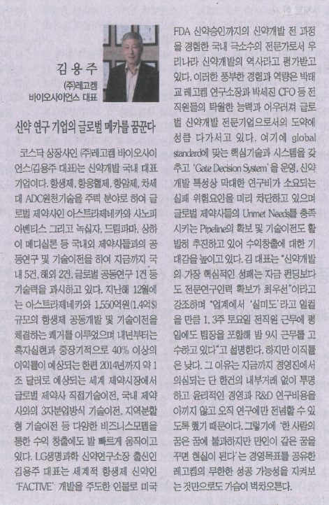 2013년 12월 26일자 서울경제신문 지면 18페이지 - 일하기 좋은 미래창조 기업에 대표이사님 인터뷰가 게재되었습니다.